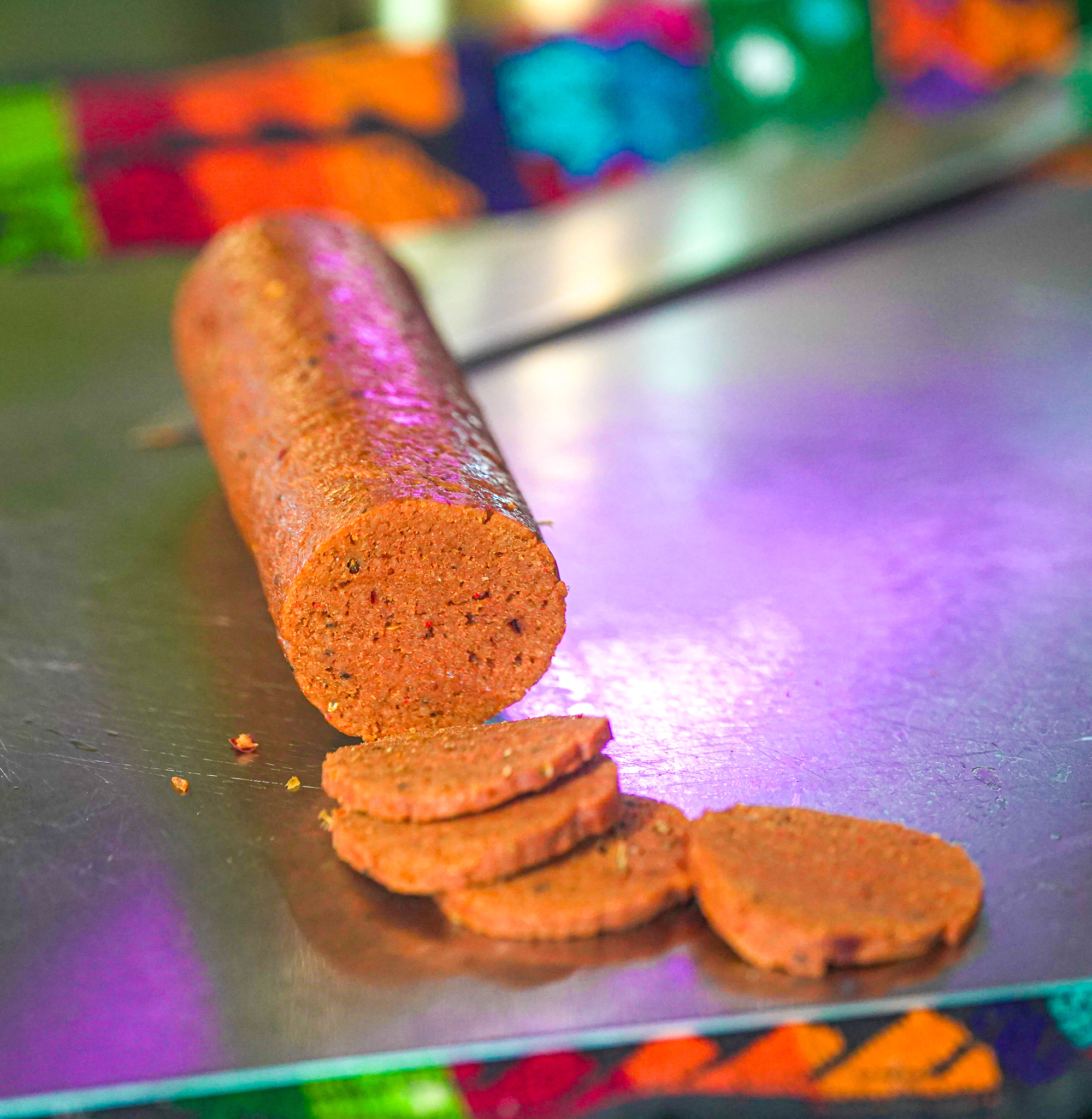 TIP: Store in the refrigerator, wrapped in parchment paper and in a sealed container, if not serving immediately. For a smoother pepperoni, blend all dry ingredients and chopped Lion’s Mane in a food processor.